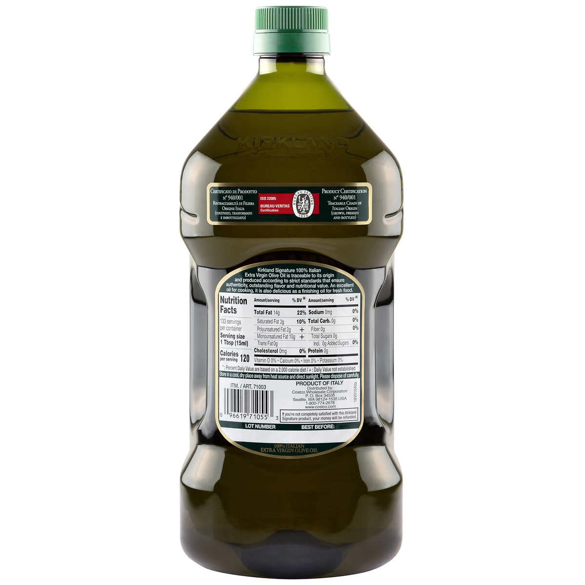 Kirkland Signature Extra Virgin Olive Oil. Produce from Italian-grown olives. Made from the first cold pressing of the olives. This oil will impart a wonderful flavor to your foods, both hot or cold.
